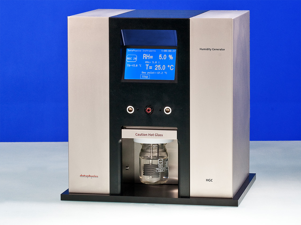 Em primeiro lugar, o ar ambiente flui através do reservatório exsicante integrado. De seguida, o ar é encaminhado- por acção de uma válvula instalada na câmara de medida controlada por um sensor de humidade e temperatura- através de um reservatório de água aquecida antes de passar através de um tubo aquecido.