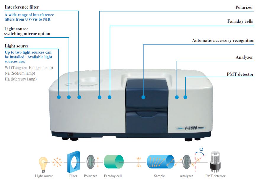 É possível equipar o P-2000 com polarizadores, filtros para diferentes comprimentos de onda, lâmpadas e fotomultiplicadores que proporcionam uma ampla gama de comprimentos de onda do UV-Vis ao IV próximo.